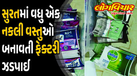 સુરતમાં વધુ એક નકલી વસ્તુઓ બનાવતી ફેક્ટરી ઝડપાઈ છે. જ્યાં બ્રાન્ડેડ સાબુ અને લીક્વીડ સહિત ઘરમાં વપરાતા કેટલાક કેમિકલવાળી ચીજ વસ્તુઓ બનાવવામાં આવતી હતી.